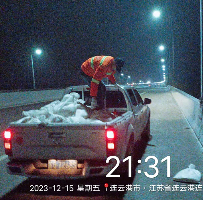 12月15日夜間21時(shí)左右,受寒潮影響,徐圩大地瞬間飄落鵝毛般雪花。為保障新城主要干道車輛、行人往來石化園區(qū)安全暢通經(jīng)過。保潔分公司結(jié)合徐圩城建與悅升公司冬季突發(fā)天氣處置預(yù)案,聞雪而動(dòng),第一時(shí)間啟動(dòng)布放融雪劑工作,大橋兩側(cè)盡顯保潔人無懼嚴(yán)寒勞動(dòng)場(chǎng)景。